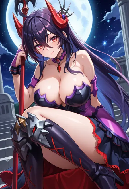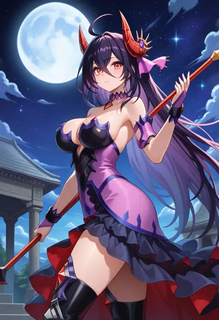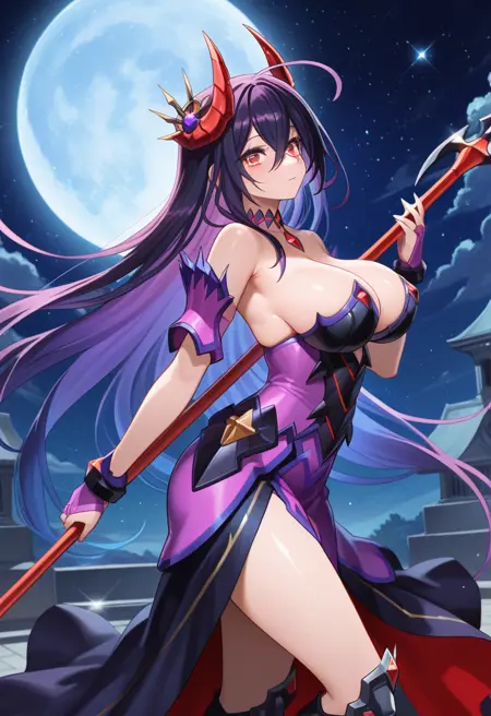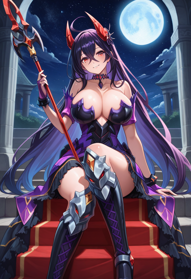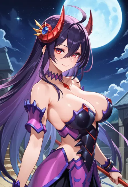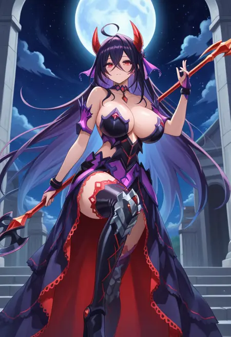 lunaris_(brave_frontier), 1girl. solo, 母性,成熟女性,黑发,紫发,发饰,红角,头发遮住眼睛,红眼,项圈,锁骨,无袖,臂环,手镯,新娘手套,紫色连衣裙,黑色短裙,及膝靴,高跟靴,