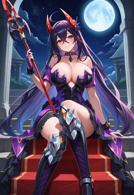 lunaris_(brave_frontier), 1girl. solo, motherly, mature woman, black hair, purple hair, hair ornament, red horns, cowlick, hair between eyes, red eyes, collar, collarbone, sleeveless, armlet, bracelet, bridal gloves,purple dress, black skirt, knee boots, high heel boots,