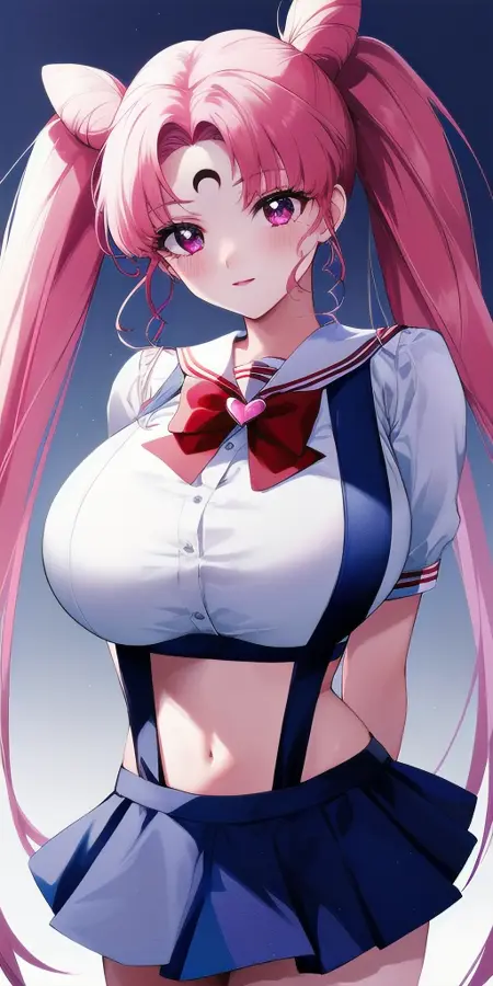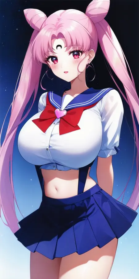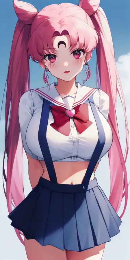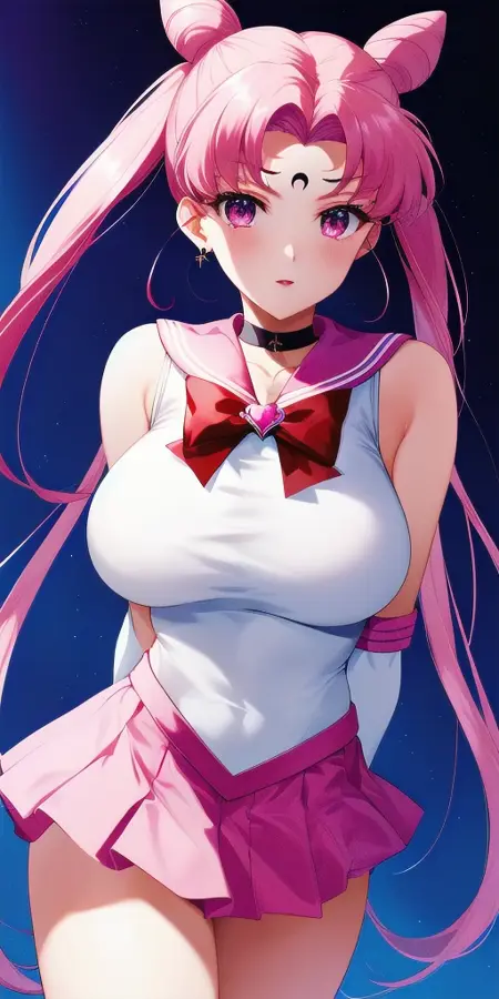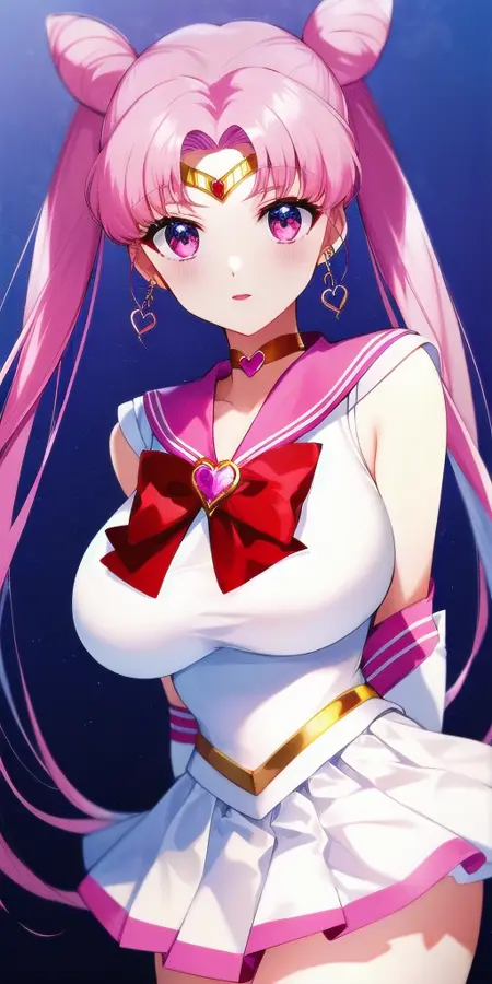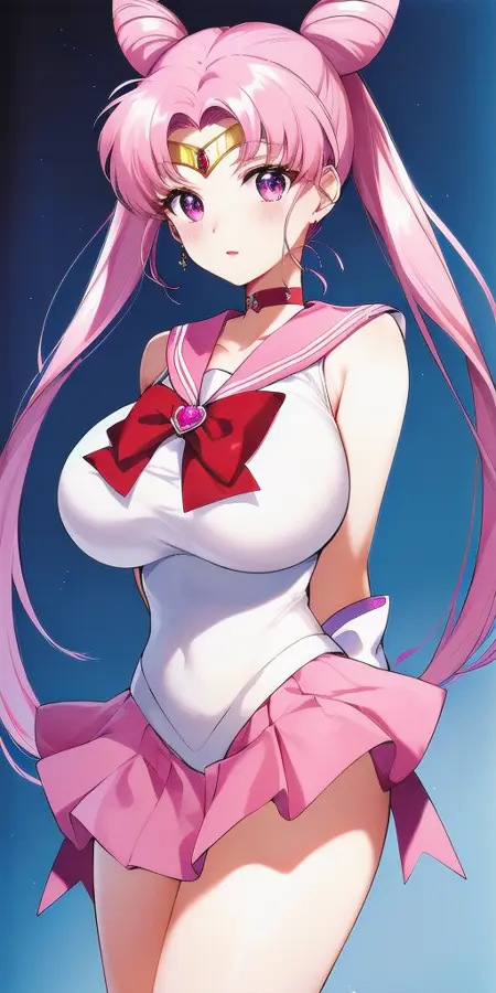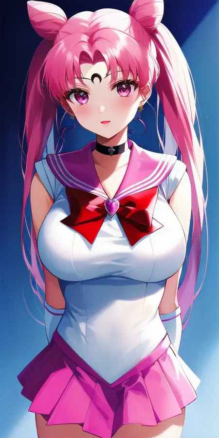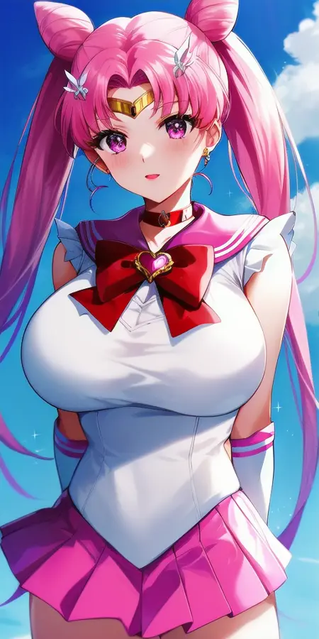 White_leotard_Pink_sailor_collar_Pink_miniskirt_White_gloves_Pink_choker_Red_bowtie_Red_back_bow_Circlet_Hairpin_Bun_cover_Brooch_Short_sleeves:彼女のRセーラー戦士のユニフォーム。これは非公式です。なぜなら、彼女は大人にならず、この姿を着ることはないからです。これは主にファンアートです。