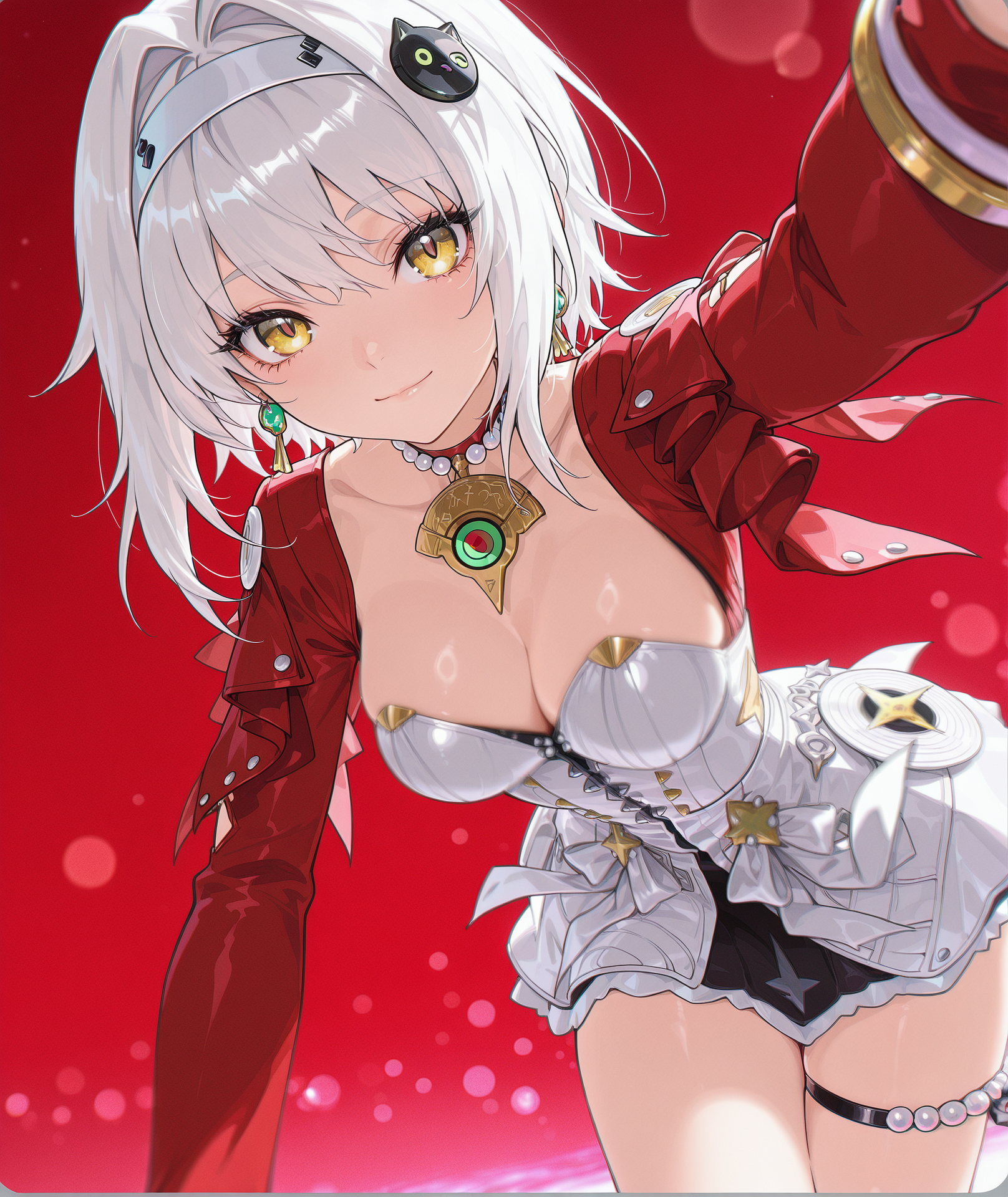 긴 소매, 드레스, 보석, 재킷, 프릴, 흰 드레스, 팔찌, 어깨 노출, 빨간 재킷, 커트 재킷, 짧은 드레스, 스커트, 허벅지, 허벅지 스트랩,