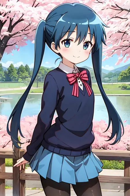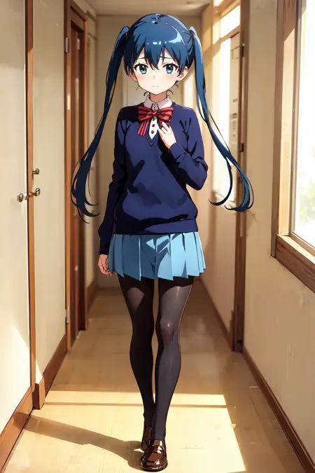 striped bow, white collared shirt, long sleeves, blue sweater, blue pleated skirt, black pantyhose, loafersSchool uniform(short sleeves):