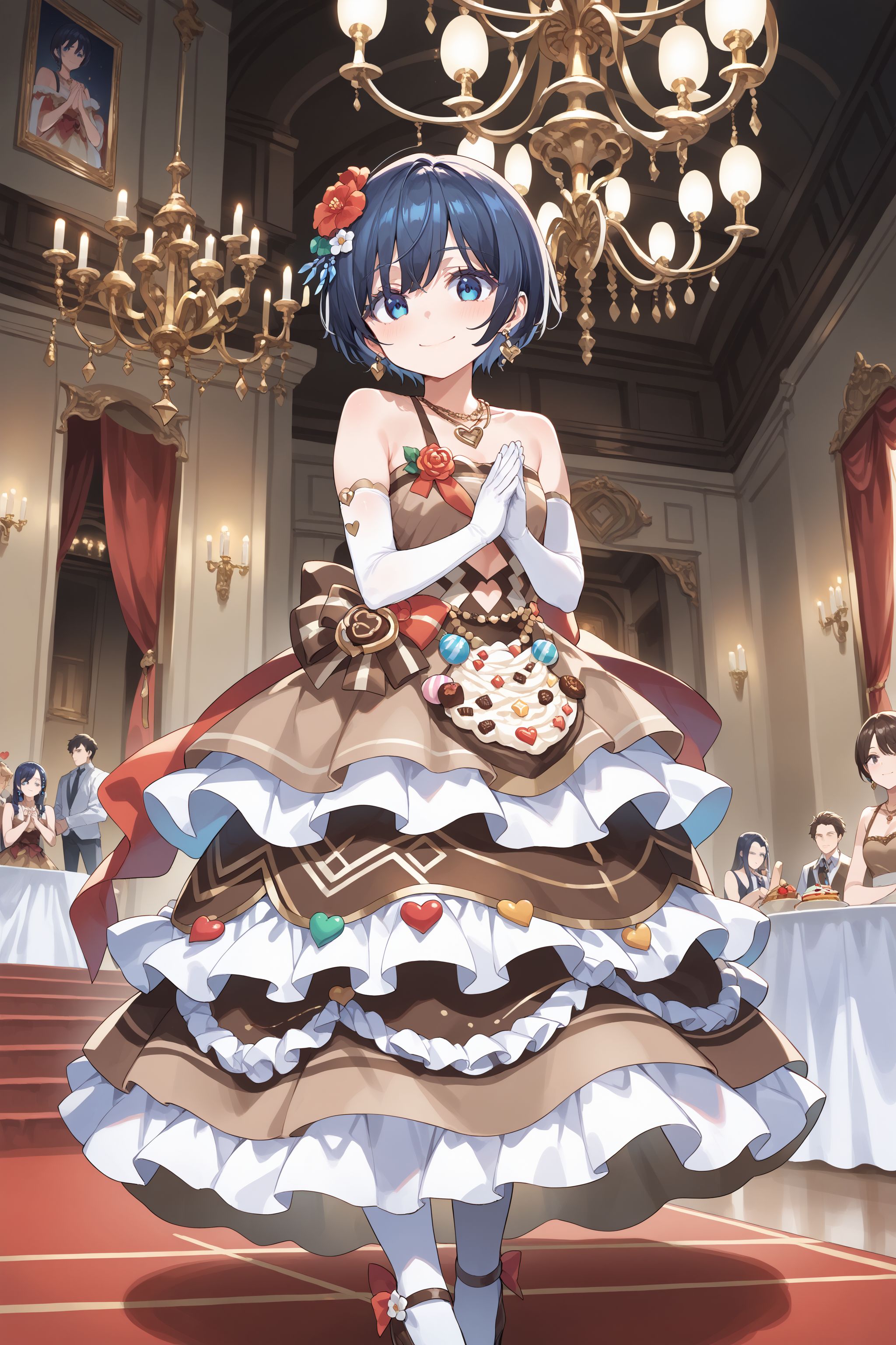 MeltyChocola: meltychocola, food-themed clothes, hair ornament, hair flower, heart, roze, earrings, necklace, jewelry, brown dress, single strap, bare shoulders, clothing cutout, elbow gloves, brown skirt, long skirt, layered skirt, brown footwear, high heels,