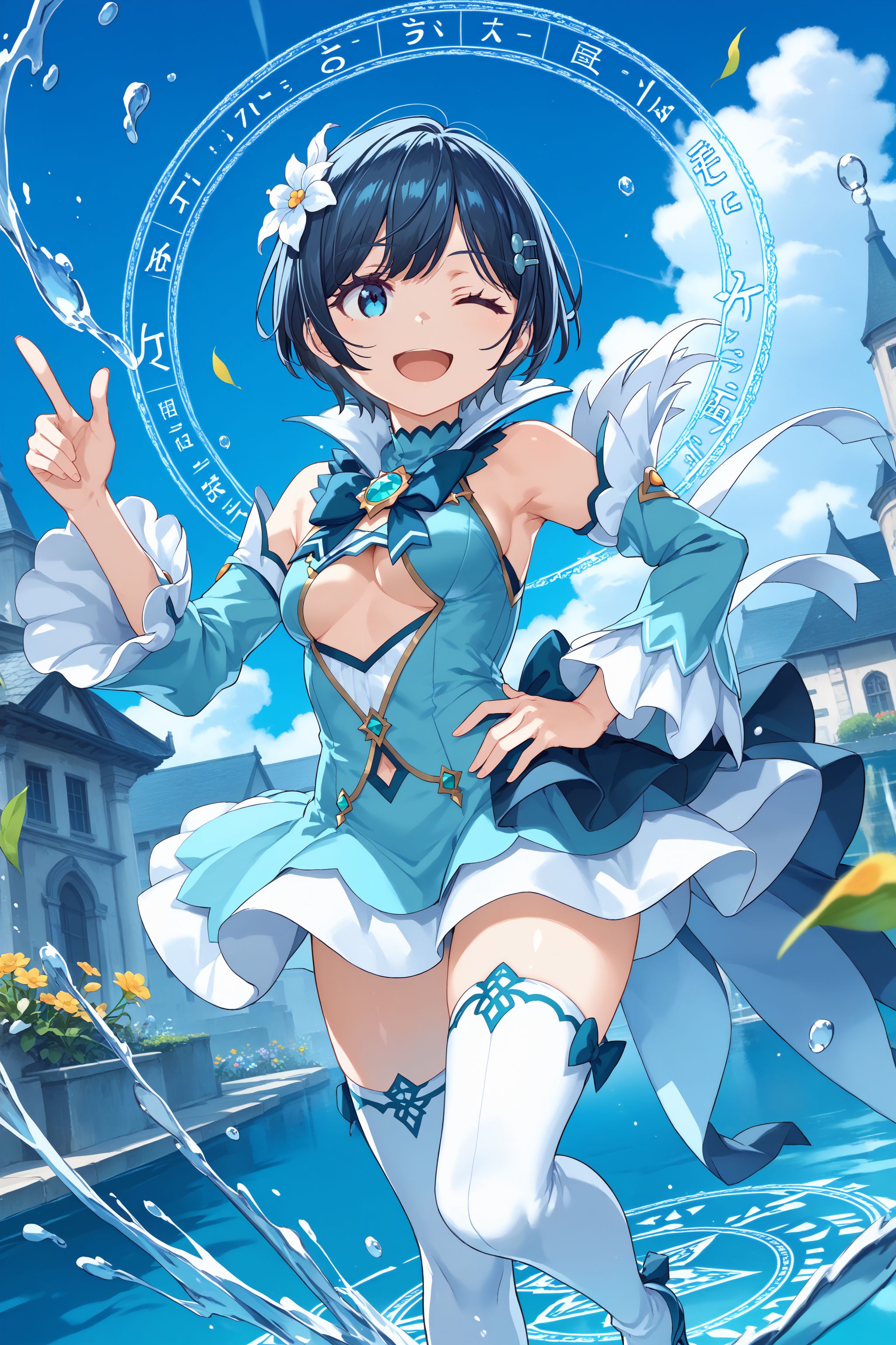Magica2020Evo: magica2020, hair flower, hairclip, aqua dress, blue bowtie, brooch, clothing cutout, underboob, navel, detached sleeves, long sleeves, white thighhighs, thigh boots, high heels, flower,