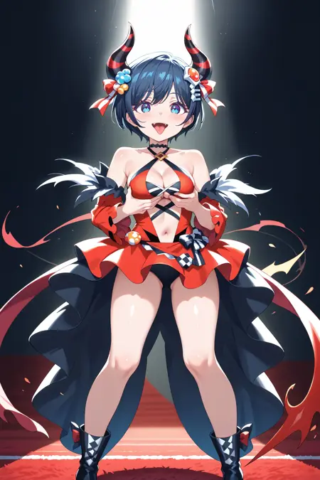 Demon'sStyleHexa: hexast, 악마 뿔, 머리 장신구, 빨간 드레스, 십자형 허리끈, 다색 드레스, 어깨 노출, 옷 자른 부분, 가슴선, 배꼽, 분리된 소매, 검은 신발, 하이힐 부츠