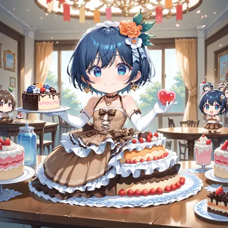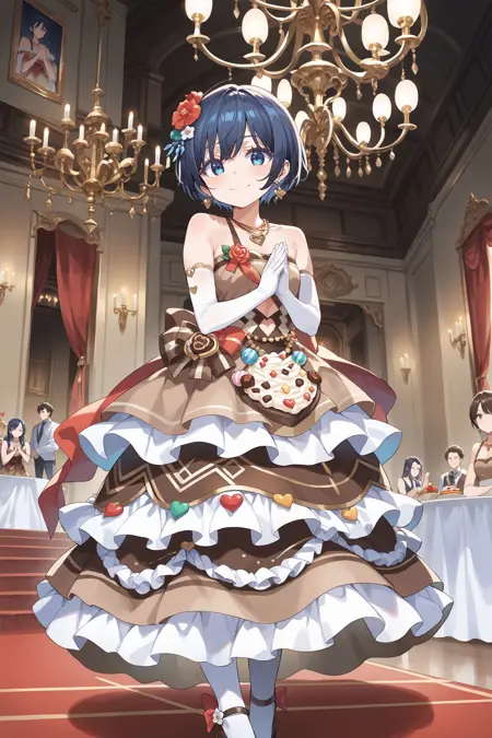 MeltyChocola: meltychocola, 음식 테마 의상, 머리 장신구, 머리 꽃, 하트, roze, 귀걸이, 목걸이, 보석, 갈색 드레스, 한 줄 스트랩, 어깨 노출, 옷 자른 부분, 팔꿈치 장갑, 갈색 치마, 긴 치마, 층층이 된 치마, 갈색 신발, 하이힐