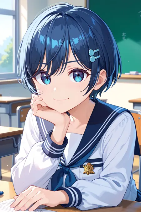 검은 머리, 파란 머리, 앞머리, 파란 눈, 작은 가슴, 단발