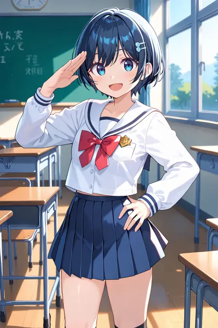 학교복: 학교복, 머리핀, 흰색 해적 칼라, 흰색 셔츠, 긴 소매, 빨간 넥타이, 접힌 치마, 파란 치마, 검은 양말, 로퍼