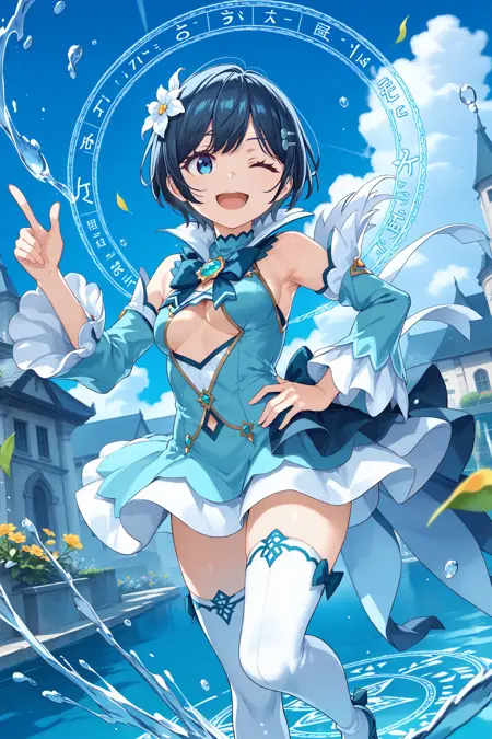 Magica2020Evo: magica2020, 머리 꽃, 머리핀, 아쿠아 드레스, 파란 넥타이, 브로치, 옷 자른 부분, 언더부브, 배꼽, 분리된 소매, 긴 소매, 흰 허벅지 양말, 허벅지 부츠, 하이힐, 꽃