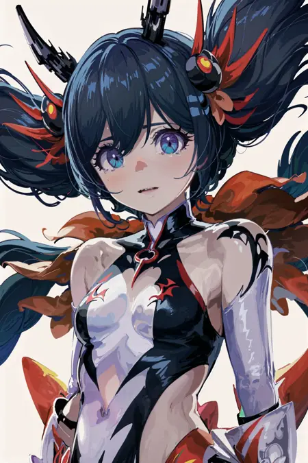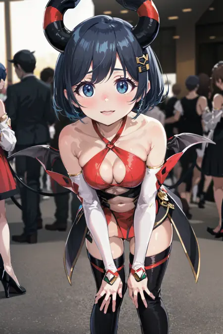 Demon'sStyleHexa: hexast, 악마 뿔, 머리 장신구, 빨간 드레스, 십자형 허리끈, 다색 드레스, 어깨 노출, 옷 자른 부분, 가슴선, 배꼽, 분리된 소매, 검은 신발, 하이힐 부츠