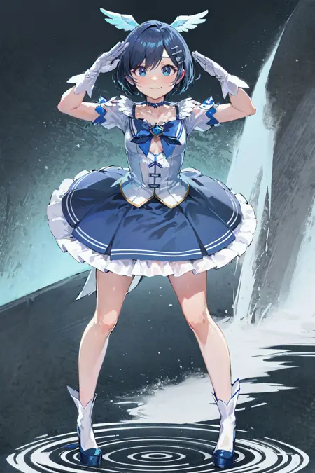 Magica2019: magica2019, 날개 모양 머리 장신구, 머리핀, 초커, 파란 드레스, 파란 넥타이, 보석, 짧은 소매, 흰 장갑, 플레이트 치마, 프릴, 파란 치마, 파란 신발, 하이힐