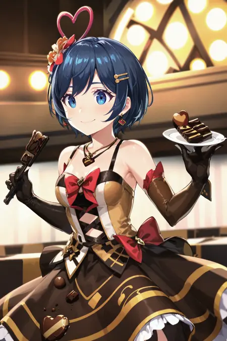 MeltyChocola: meltychocola, 음식 테마 의상, 머리 장신구, 머리 꽃, 하트, roze, 귀걸이, 목걸이, 보석, 갈색 드레스, 한 줄 스트랩, 어깨 노출, 옷 자른 부분, 팔꿈치 장갑, 갈색 치마, 긴 치마, 층층이 된 치마, 갈색 신발, 하이힐