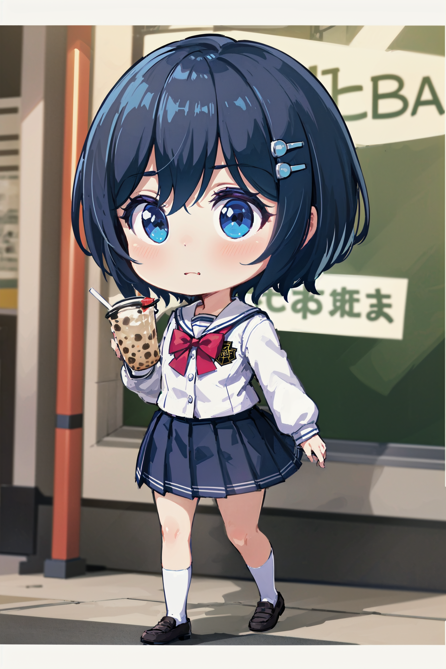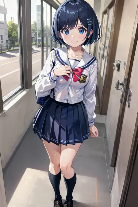 학교복: 학교복, 머리핀, 흰색 해적 칼라, 흰색 셔츠, 긴 소매, 빨간 넥타이, 접힌 치마, 파란 치마, 검은 양말, 로퍼