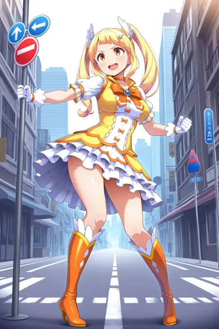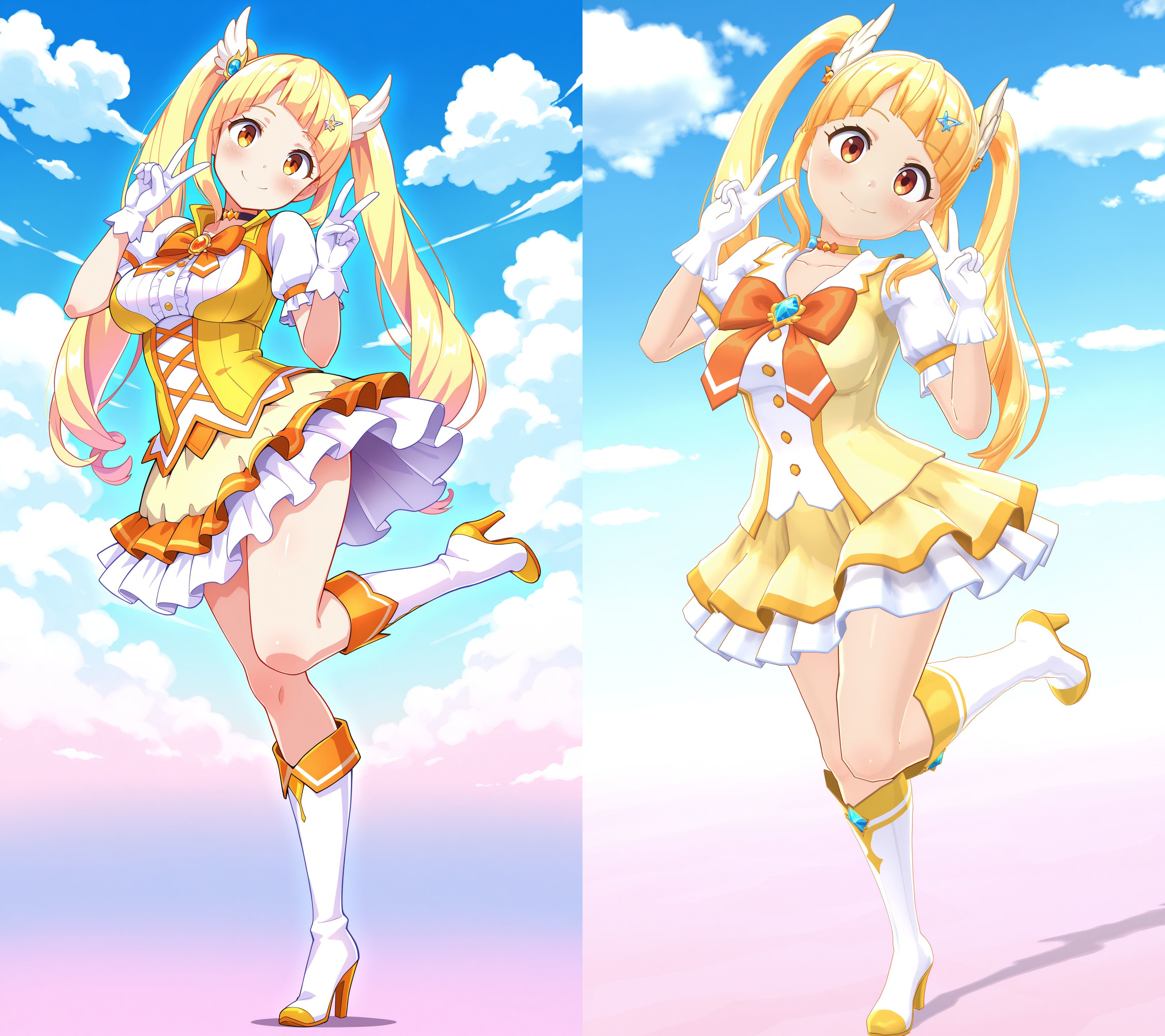 Magica2019: magica2019、翼型の髪飾り、髪飾り、髪留め、チョーカー、黄色いドレス、オレンジのリボン、宝石、短袖、白い手袋、フリル、レイヤードスカート、膝上ブーツ、リボン、ハイヒール、オレンジの靴