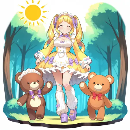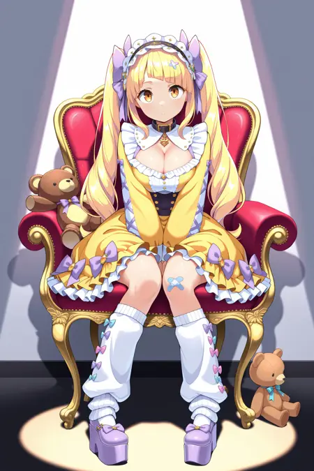 LastMagica: lastmagica、頭飾り、髪のリボン、紫のリボン、首輪、黄色いドレス、フリル付きドレス、バストライン、長袖、ぬいぐるみ、ぬいぐるみ、絆創膏、テディベア、白いレッグウォーマー、プラットフォームシューズ、紫色の靴