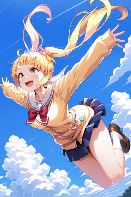 学ラン: 学校制服、髪飾り、髪留め、黄色いカーディガン、白いセーラー襟、赤いリボン、長袖、手首より長い袖、ボタンバッジ、青いスカート、プリーツスカート、ミニスカート、白い靴下、ローファー