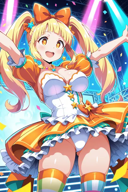 Magica2020Evo: magica2020、髪のリボン、オレンジのリボン、星\(記号\)、ジュエリー、ネックレス、縦縞のドレス、オレンジのドレス、ふくらはぎの短袖、白いレオタード、フリル付きスカート、縞模様のタイツ、ハイヒールブーツ