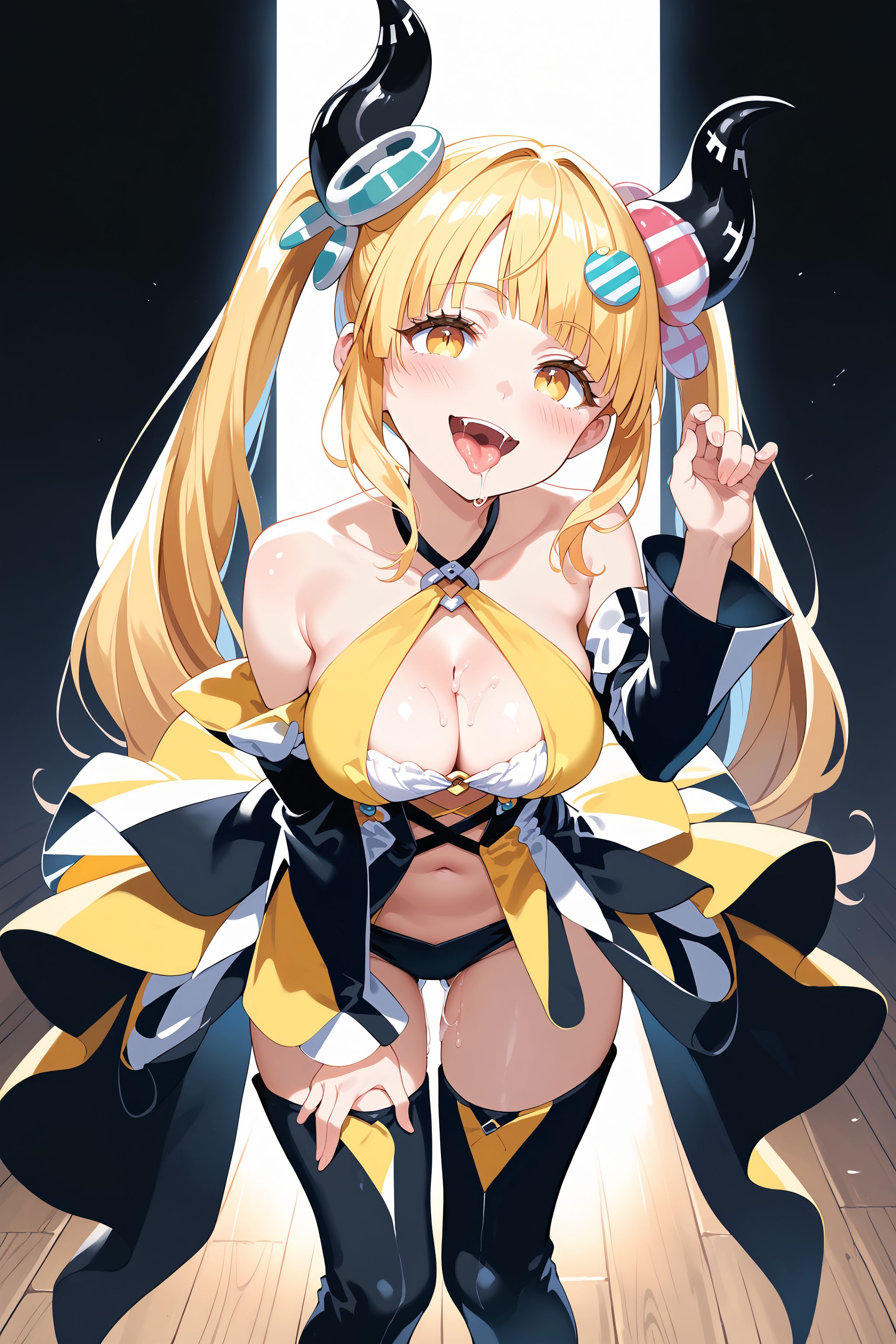 Demon'sStyleHexa: hexast, demon horn, hair ornament, yellow dress, criss-cross halter, multicolored dress, bare shoulders, cleavage, navel, detached sleeves, black footwear, thigh boots