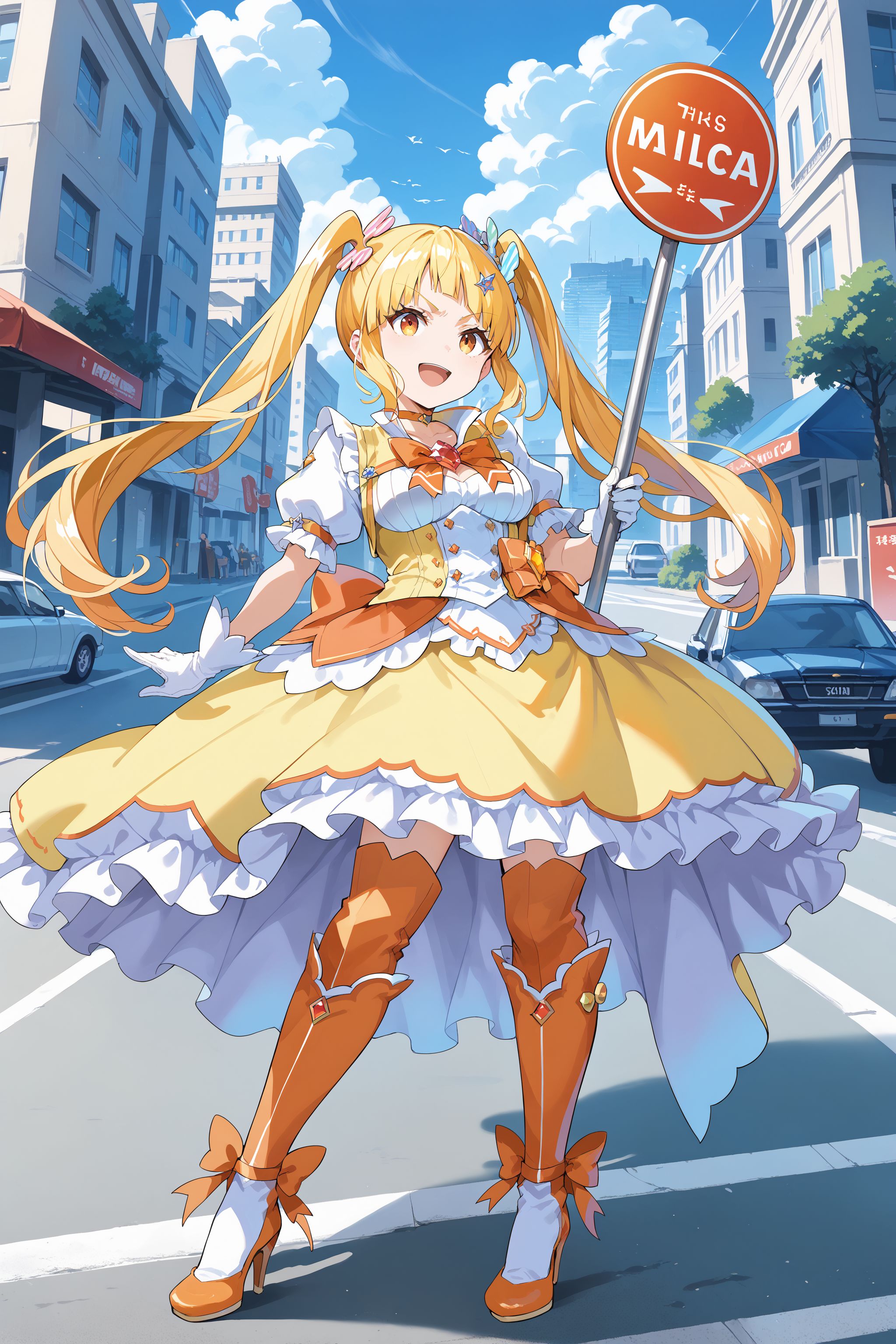Magica2019: magica2019, wing hair ornament, hair ornament, hairclip, choker, yellow dress, orange bowtie, gem, short_sleeves, white gloves, frills, layered skirt, knee boots, bow, high heels, orange footwear