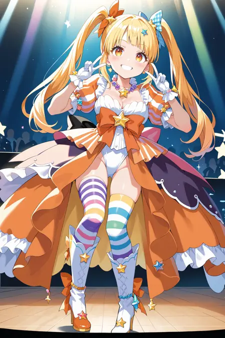 Magica2020Evo: magica2020、髪のリボン、オレンジのリボン、星\(記号\)、ジュエリー、ネックレス、縦縞のドレス、オレンジのドレス、ふくらはぎの短袖、白いレオタード、フリル付きスカート、縞模様のタイツ、ハイヒールブーツ