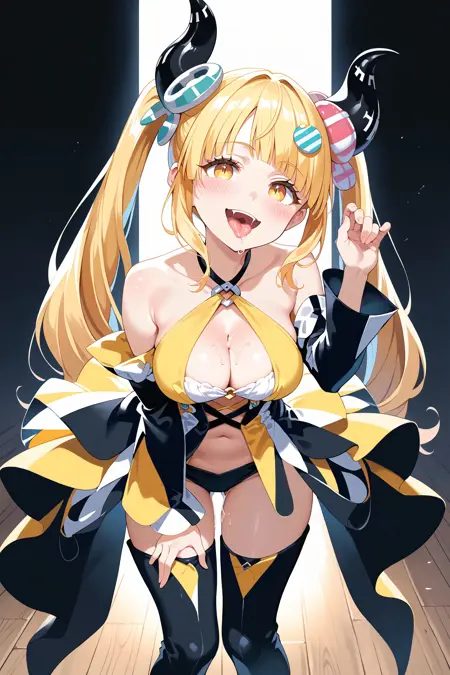 Demon'sStyleHexa: hexast、悪魔の角、髪飾り、黄色いドレス、クロスハーネス、多色のドレス、肩出し、バストライン、へそ、外れた袖、黒い靴、太ももブーツ