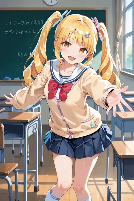 学ラン: 学校制服、髪飾り、髪留め、黄色いカーディガン、白いセーラー襟、赤いリボン、長袖、手首より長い袖、ボタンバッジ、青いスカート、プリーツスカート、ミニスカート、白い靴下、ローファー