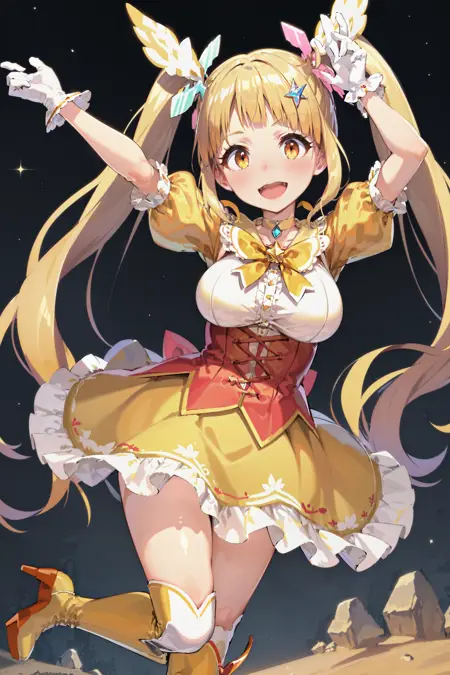 Magica2019: magica2019,翅膀发饰,发饰,发夹,项圈,黄色连衣裙,橙色蝴蝶结,宝石,短袖,白色手套,荷叶边,层叠裙,及膝靴,蝴蝶结,高跟鞋,橙色鞋履