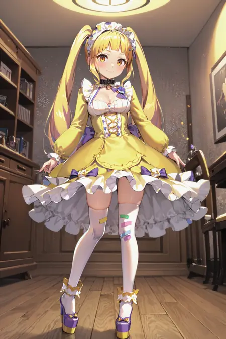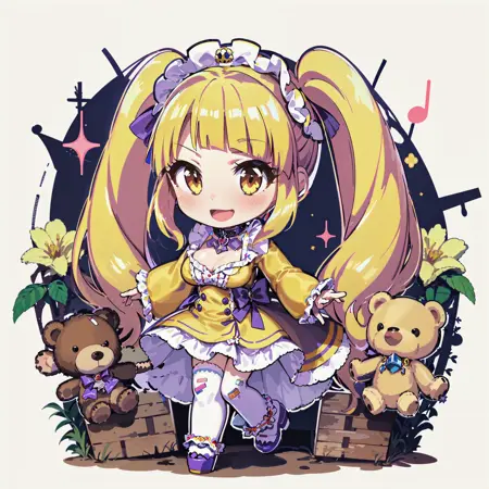 LastMagica: lastmagica,头饰,发带,紫色蝴蝶结,领子,黄色连衣裙,褶边连衣裙,乳沟,长袖,毛绒玩具,毛绒动物,创可贴,泰迪熊,白色腿套,厚底鞋,紫色鞋履
