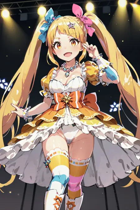 Magica2020Evo: magica2020,发带,橙色蝴蝶结,星星\(符号\),珠宝,项链,竖条纹连衣裙,橙色连衣裙,蓬松短袖,白色紧身衣,褶边裙,条纹长筒袜,高跟靴