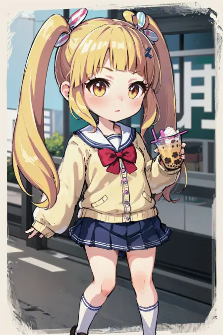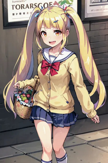 校服: 校服,发饰,发夹,黄色开衫,白色水手领,红色蝴蝶结,长袖,袖子过腕,徽章纽扣,蓝色裙子,百褶裙,超短裙,白袜,船鞋