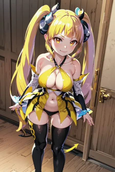 Demon'sStyleHexa: hexast,恶魔角,发饰,黄色连衣裙,交叉背带,多彩连衣裙,露肩,乳沟,肚脐,分离袖,黑色鞋履,大腿靴