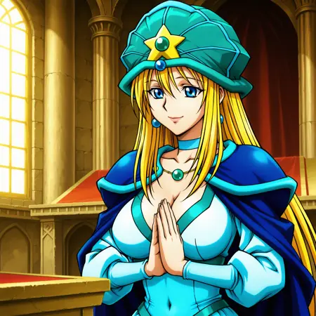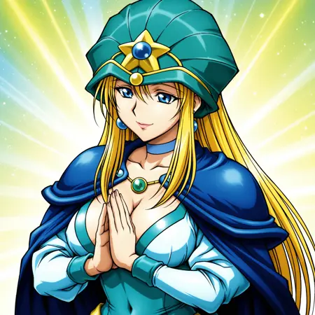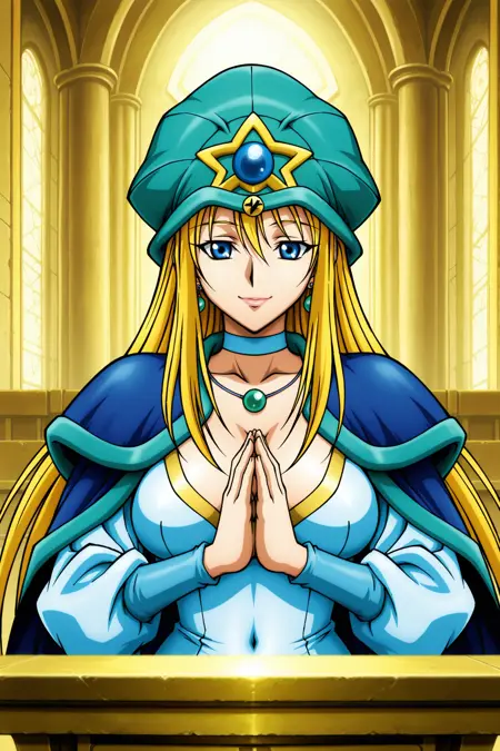 yugioh_card_style, yugioh_card_for_doriado, blue eyes, lips, blonde hair, long hair, very long hair, straight hair, earrings, necklace, large breasts, collarbone, covered navel, cleavage, smile, praying, light blue choker, green hat, star ornament, long sleeves, puffed sleeves, blue and white outfit, blue dress, blue cloak, teal inner dress, gold trim, teal high heel boots