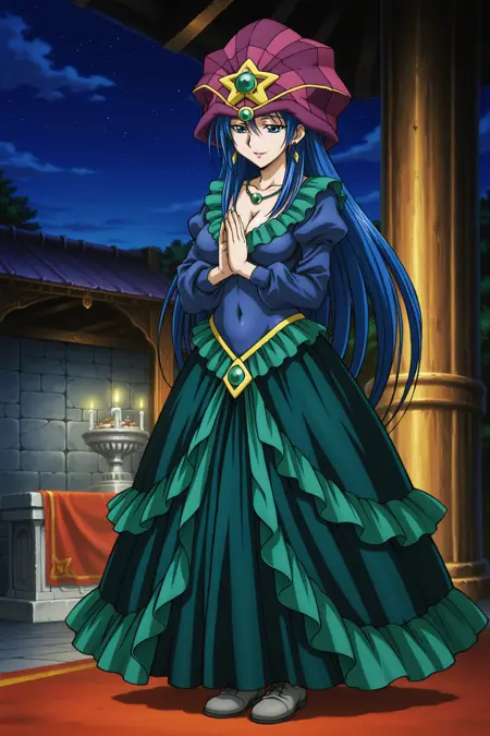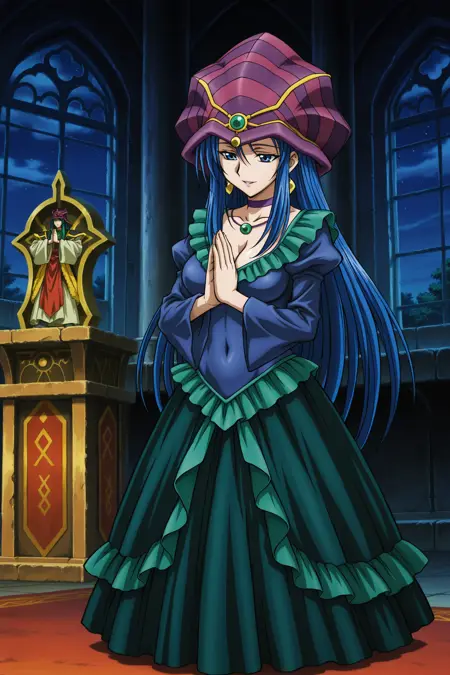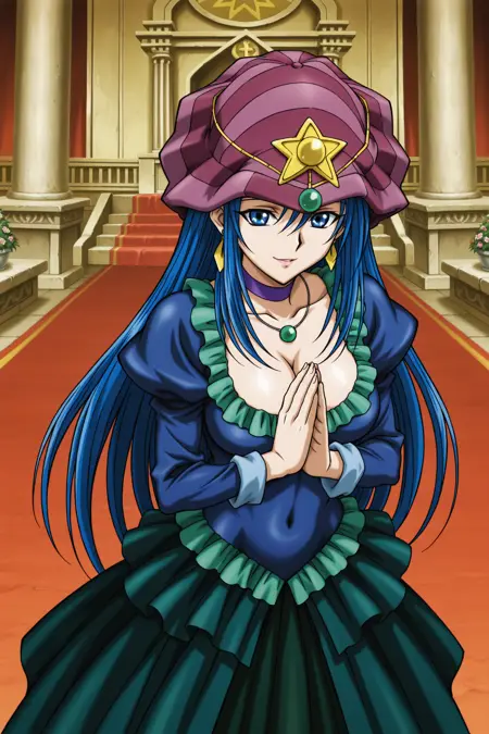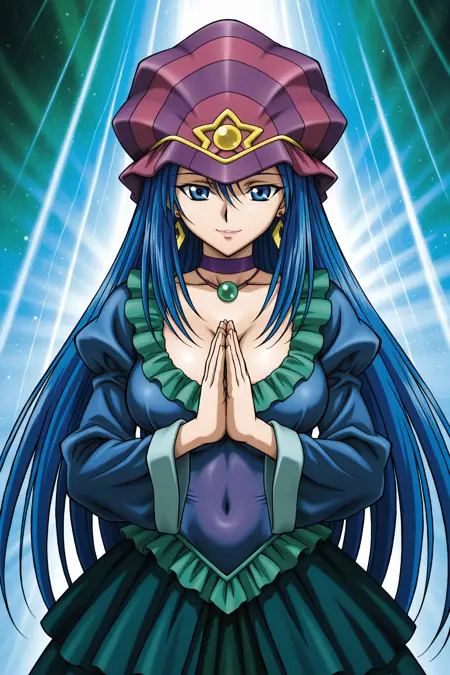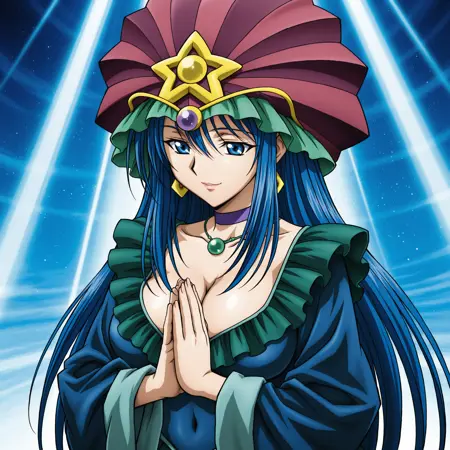yugioh_card_style, yugioh_card_for_lady_of_faith, blue eyes, lips, blue hair, long hair, very long hair, straight hair, earrings, necklace, large breasts, collarbone, covered navel, cleavage, smile, praying, purple choker, purple and red striped hat, star ornament, long sleeves, puffed sleeves, green collar, blue robe, dark green skirt, deep blue overskirt, green frills, tiered ruffles, gray boots
