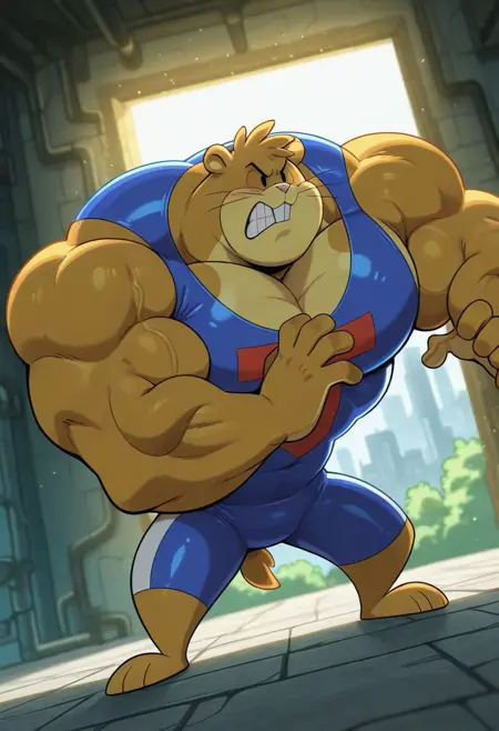 강화 프롬프트: "풍부한 털, 짧은 꼬리, 검은 눈, 근육질, 남성스러운, 가슴근"