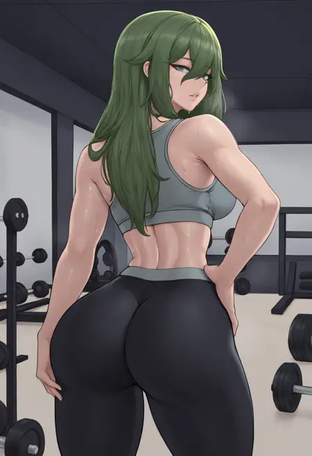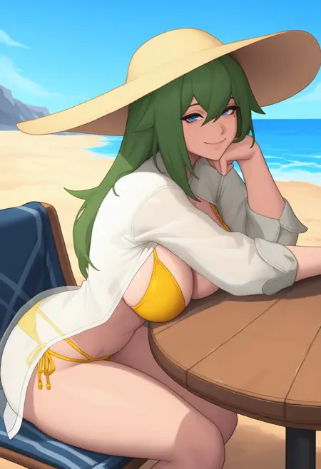 외모: 눈 밑 두더지, 긴 머리, 녹색 머리, 눈 사이 머리, 파란 눈, 큰 가슴