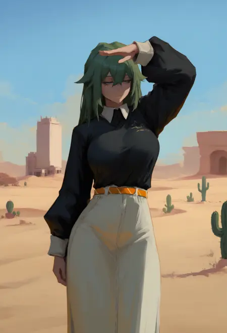 기본 복장: 검은 셔츠, 칼라 셔츠, 셔츠 안으로 넣음, 긴 소매, 긴 치마, 흰 치마, 주황색 벨트