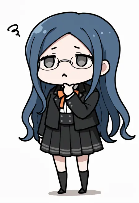 デフォルトの外見: defTsu、青い髪、長い髪、灰色の目、眼鏡、黒いジャケット、開いたジャケット、長い袖、白いシャツ、カラーシャツ、大きな胸、オレンジ色のボウタイ、ハイウエストスカート、黒いスカート、プリーツスカート、黒い靴下、膝丈靴下