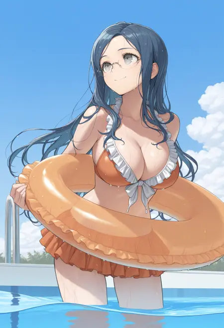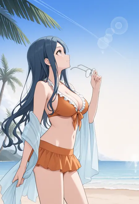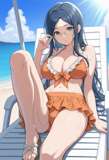 水着 (DRS): swimTsu、青い髪、長い髪、灰色の目、眼鏡、フリル付きビキニ、オレンジ色のビキニ、胸元の露出、大きな胸、前面結びトップ、ビキニスカート