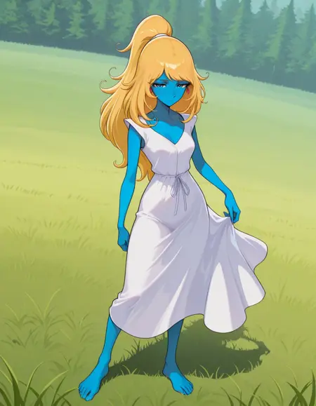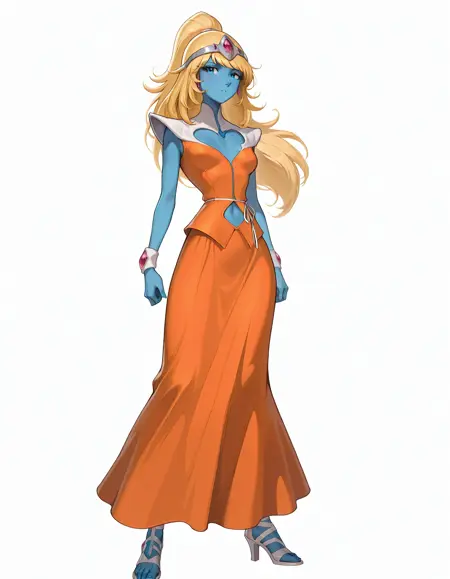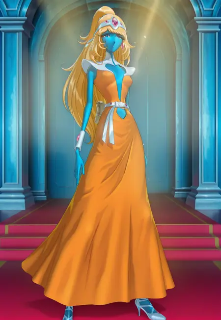 ST3LL4-Inter5555, blue skin, blue eyes, pointy ears, long hair, blonde hair, ponytail, white shoulder pads, orange dress, dress with white shoulder pads, open white high heels, metal tiara adorned with red gems, red earrings, thin female