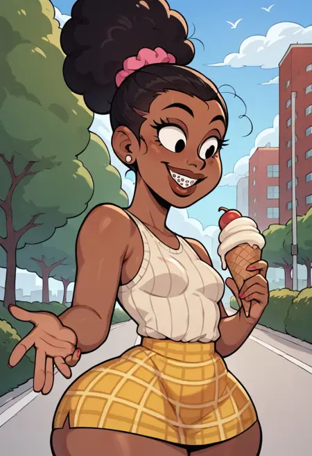 (Bluan loud) (brown skin,black hair,afro hair,ponytail hairstyle,black eyes,thick lips,pink hair scrunchie) (braces,buck teeth)(tall:0.7) (small breasts,thin arms,huge hips,huge thighs,huge butt,long legs) (light brown sweater,white undershirt,sleeveless,yellow plaid skirt,white socks,brown mary jane shoes)
