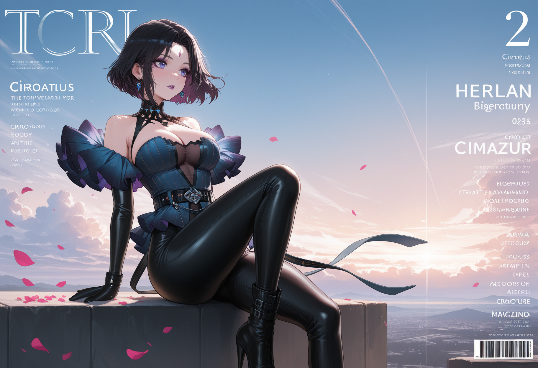 선택적 옷 태그: 귀걸이, 비대칭 복장, 어깨 노출, 벨트, 검은 바디수트, 검은 신발, 검은 장갑, 부츠, 가슴, 젖가슴 노출, 드레스, 팔꿈치 장갑, 하이힐 부츠, 큰 가슴,