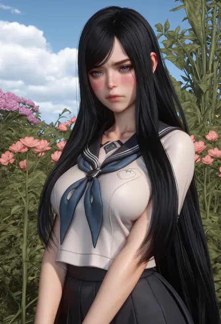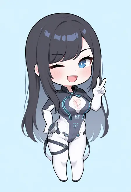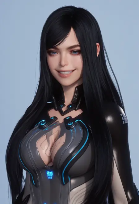r4vilf, 1girl, very long hair, black hair, blue eyes, swept bangs, bodysuit, breasts, cleavage, cleavage cutout