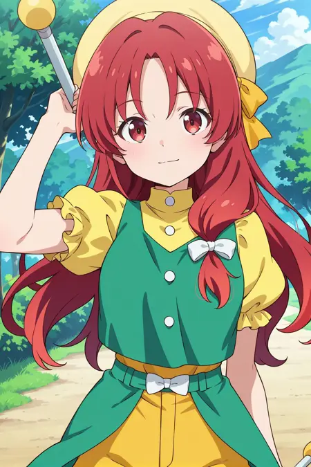 黄色头饰,发带,高领,绿色上衣,内衣,黄色内衣,黄色袖子,白色扣子,蓬松短袖,褶边袖子,黄色短裤,