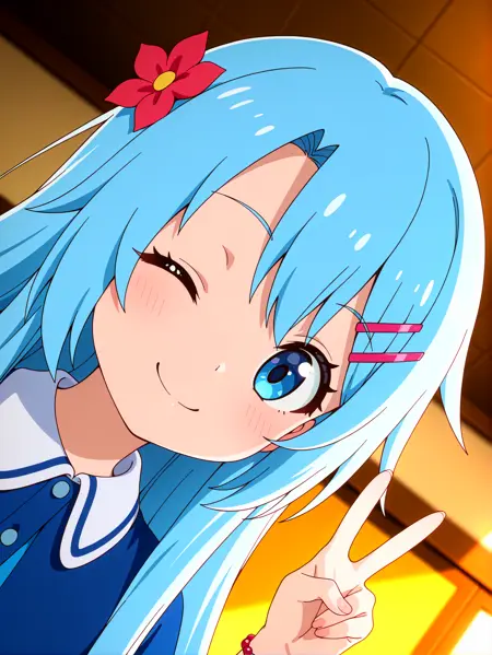 akuri \(tuam\), hairclip, hair ornament, hair flower, bracelet, blue dress, blue footwear