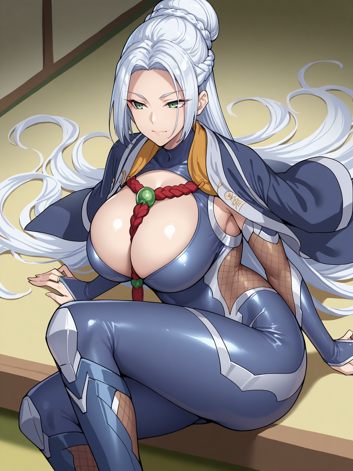 Apperance: inagenatsu, white hair, very long hair, braid, hair bun, green eyes, large breasts, mature female