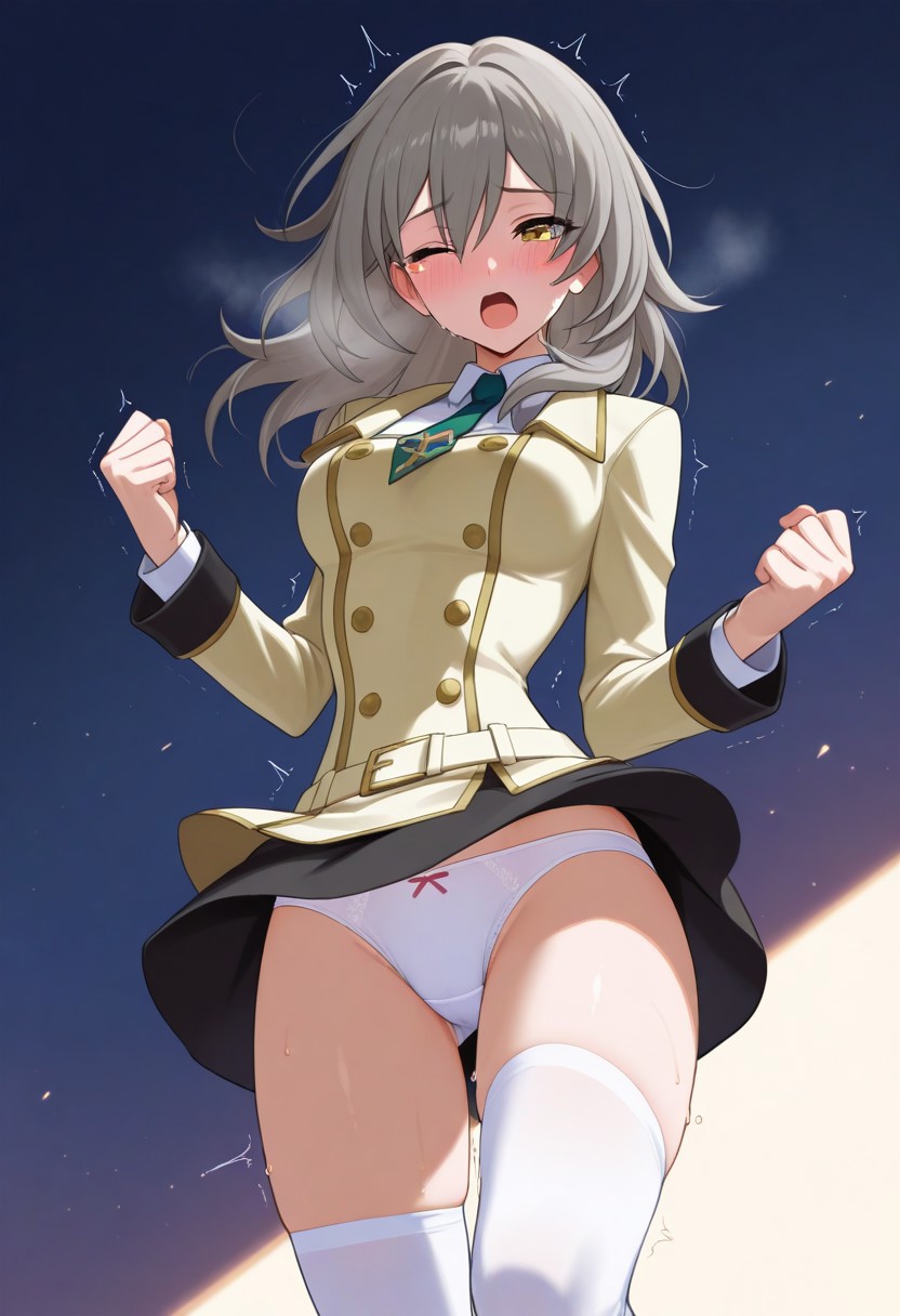 AshAca uniform, white undershirt, green tie, tan double-breasted jacket with gold trim, black skirt, miniskirt