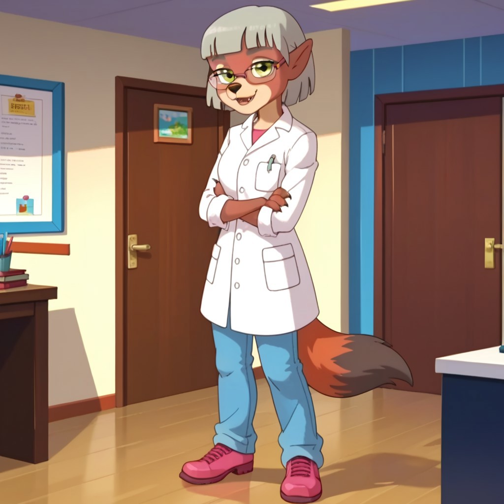 dioptric glasses, white lab coat, breast pocket, pink under shirt, denim jeans, pink shoes,