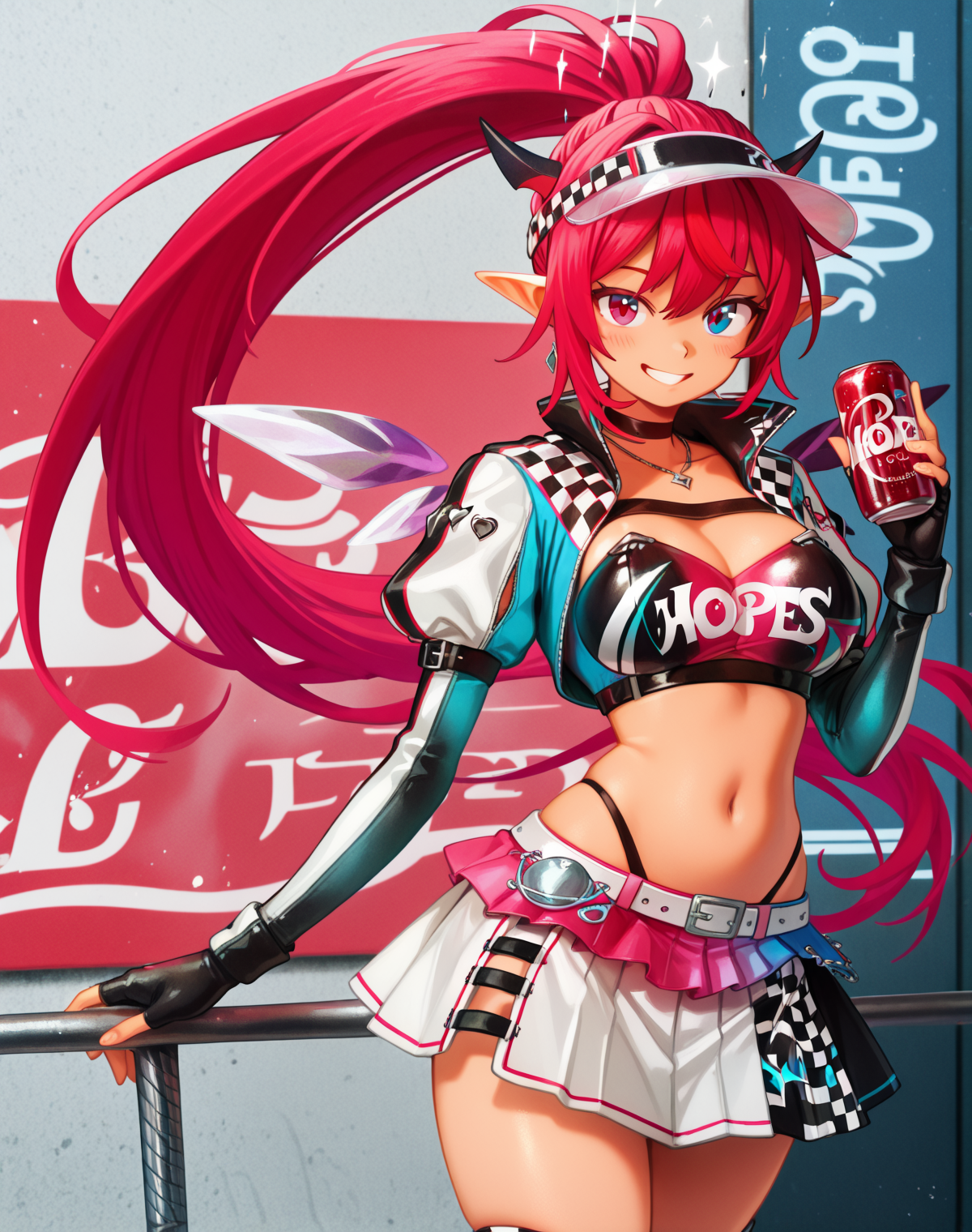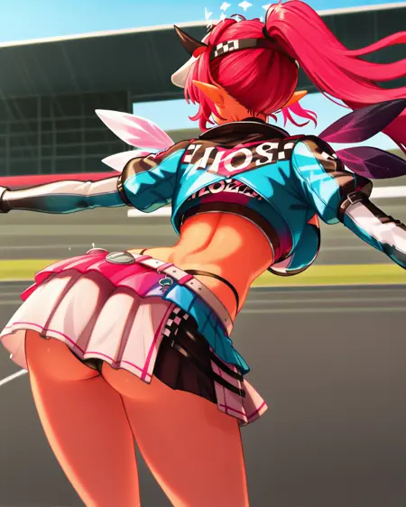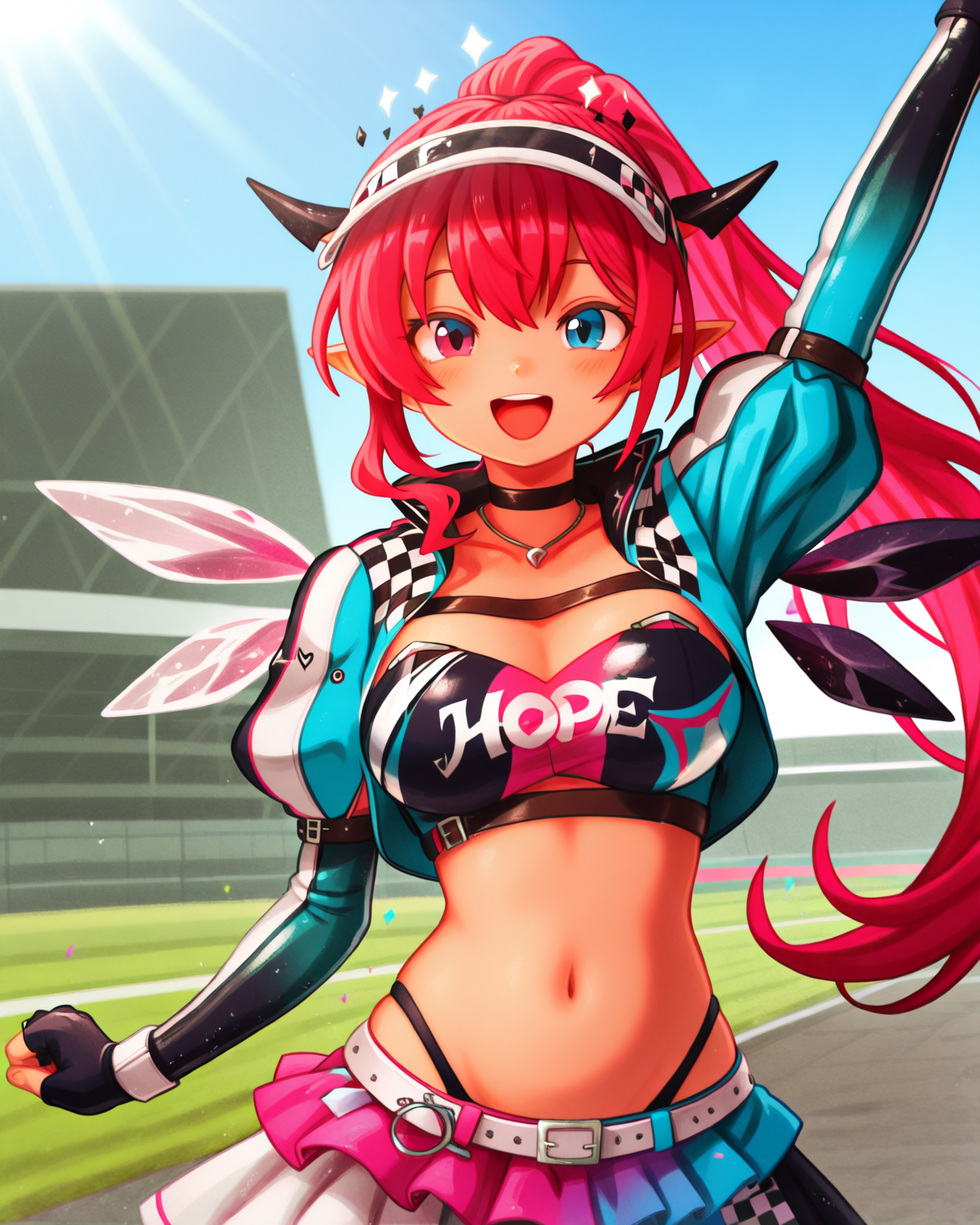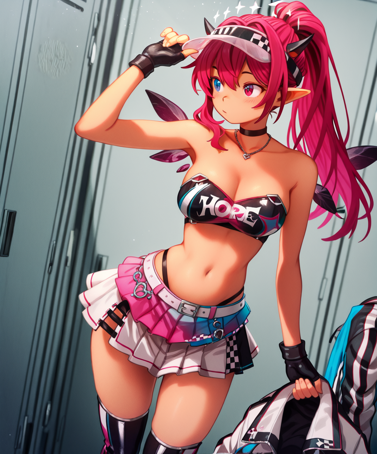 복장 태그: 포니테일, 이질성 색채, 손가락 없는 장갑, 초커, 레이스퀸, 벨트, 날개, 투명 헬멧, 줄인 재킷, 목걸이, 치마, 허벅지 부츠
