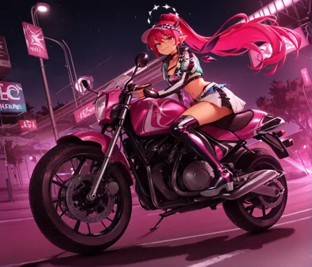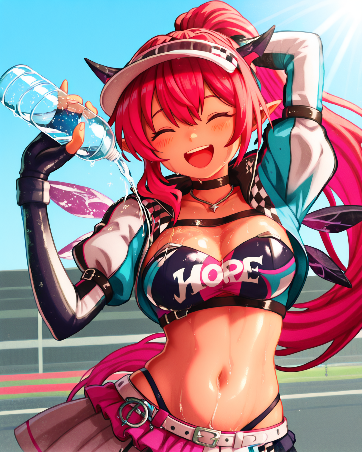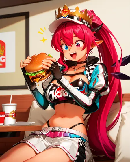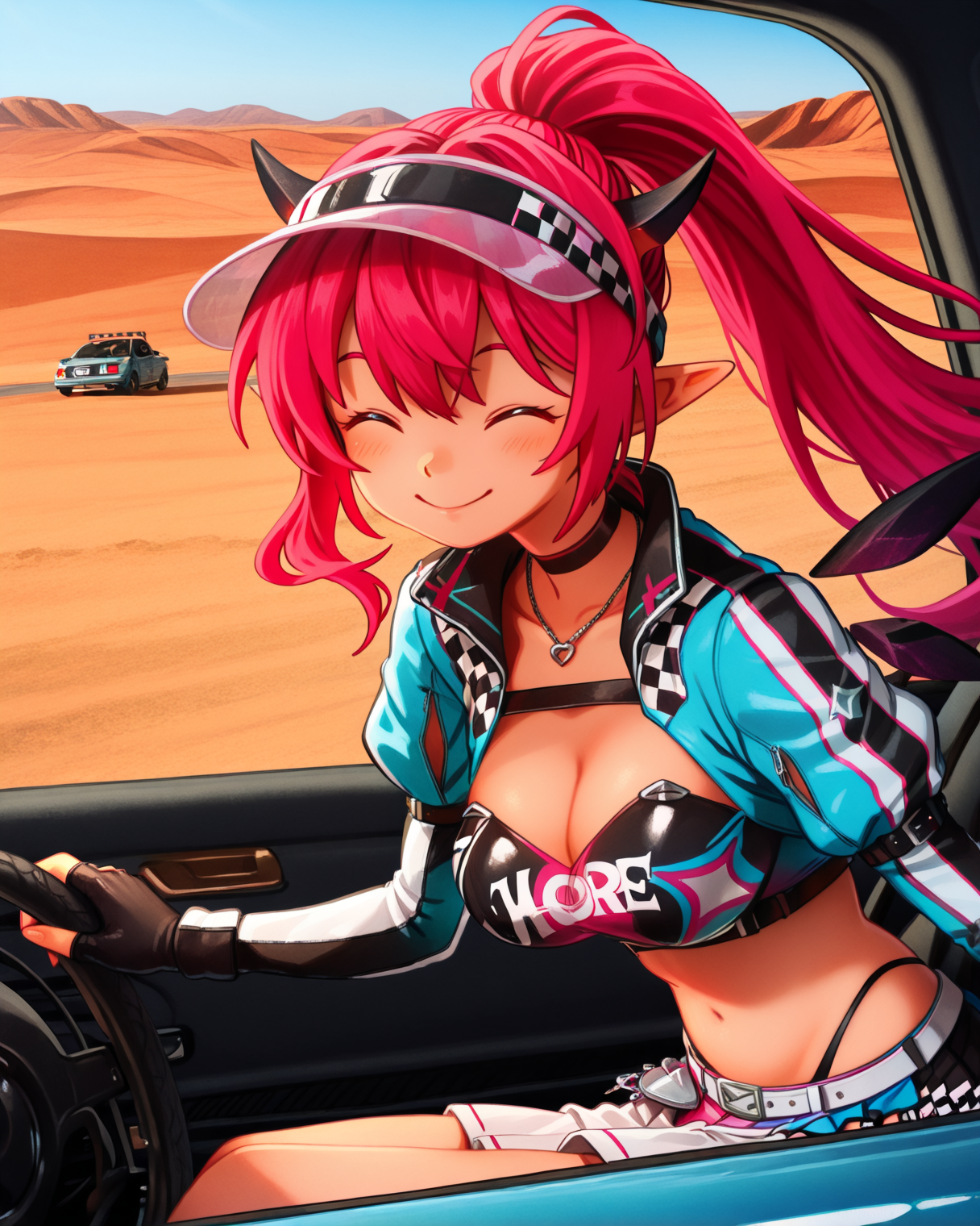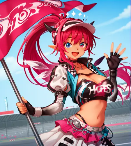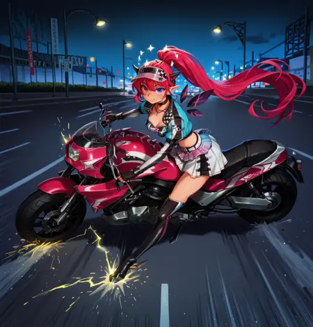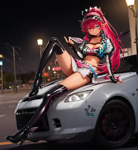 복장 태그: 포니테일, 이질성 색채, 손가락 없는 장갑, 초커, 레이스퀸, 벨트, 날개, 투명 헬멧, 줄인 재킷, 목걸이, 치마, 허벅지 부츠