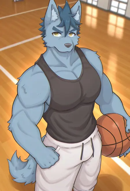 "wolf, furry, tail, yellow eyes, blue hair, muscular, toned male, large pectorals"服装提示:
