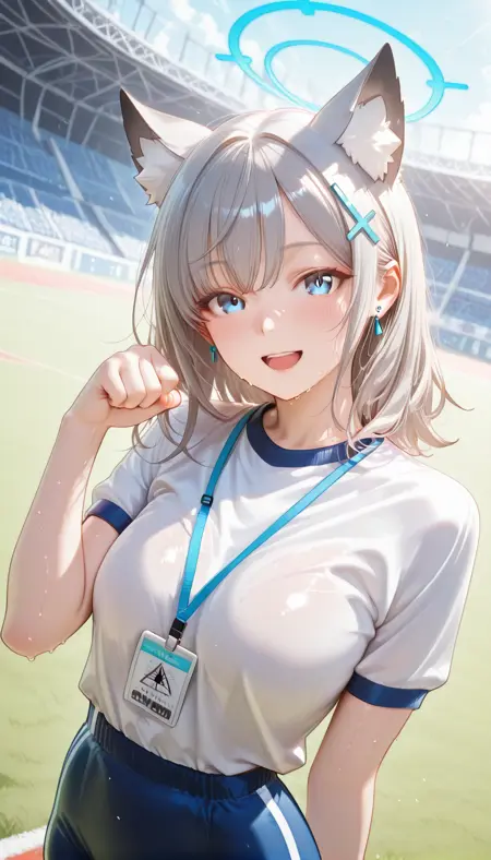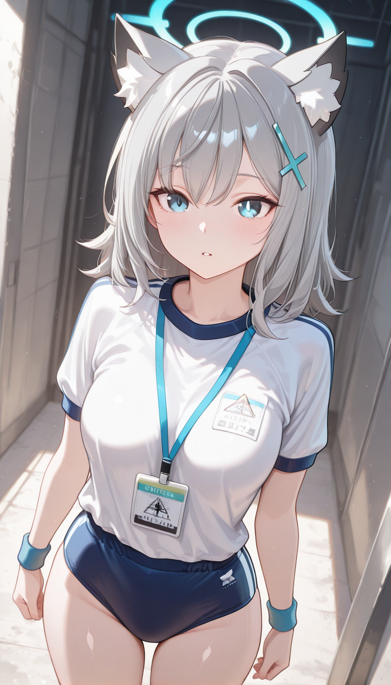 シャツ、ジュエリー、白いシャツ、ショートスリーブ、太もも、リストバンド、体育着、ブルマ、IDカード、体育シャツ、ネックストラップ、青いブルマ、汗バンド、名札、